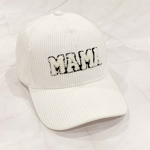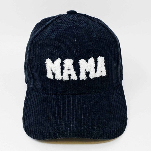 Adorable corduroy MAMA ball cap with fuzzy patch lettering! Has great fit with perfect curved brim. Clip closure on the back to adjust size and hidden pocket for seamless look. Great details all around.
