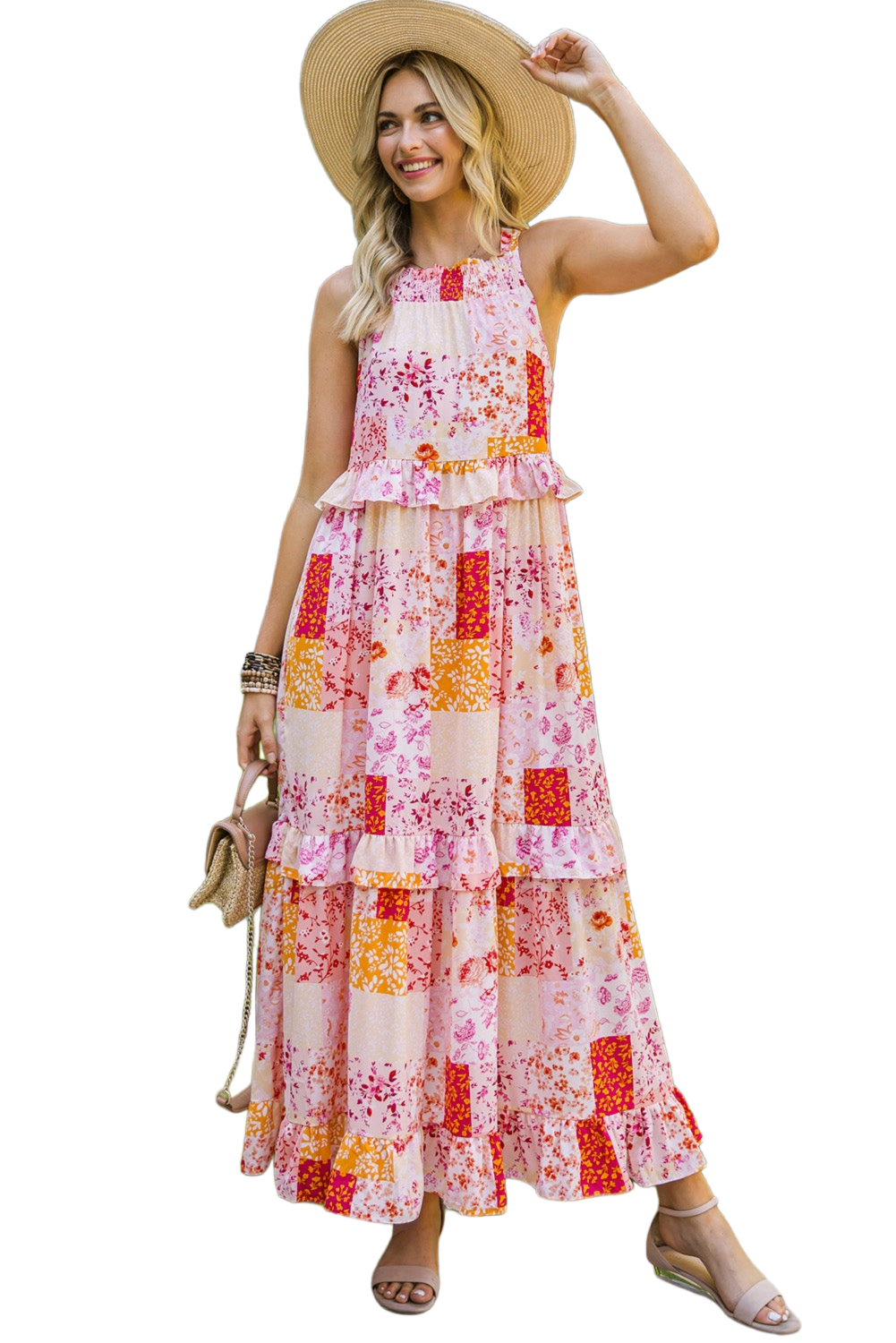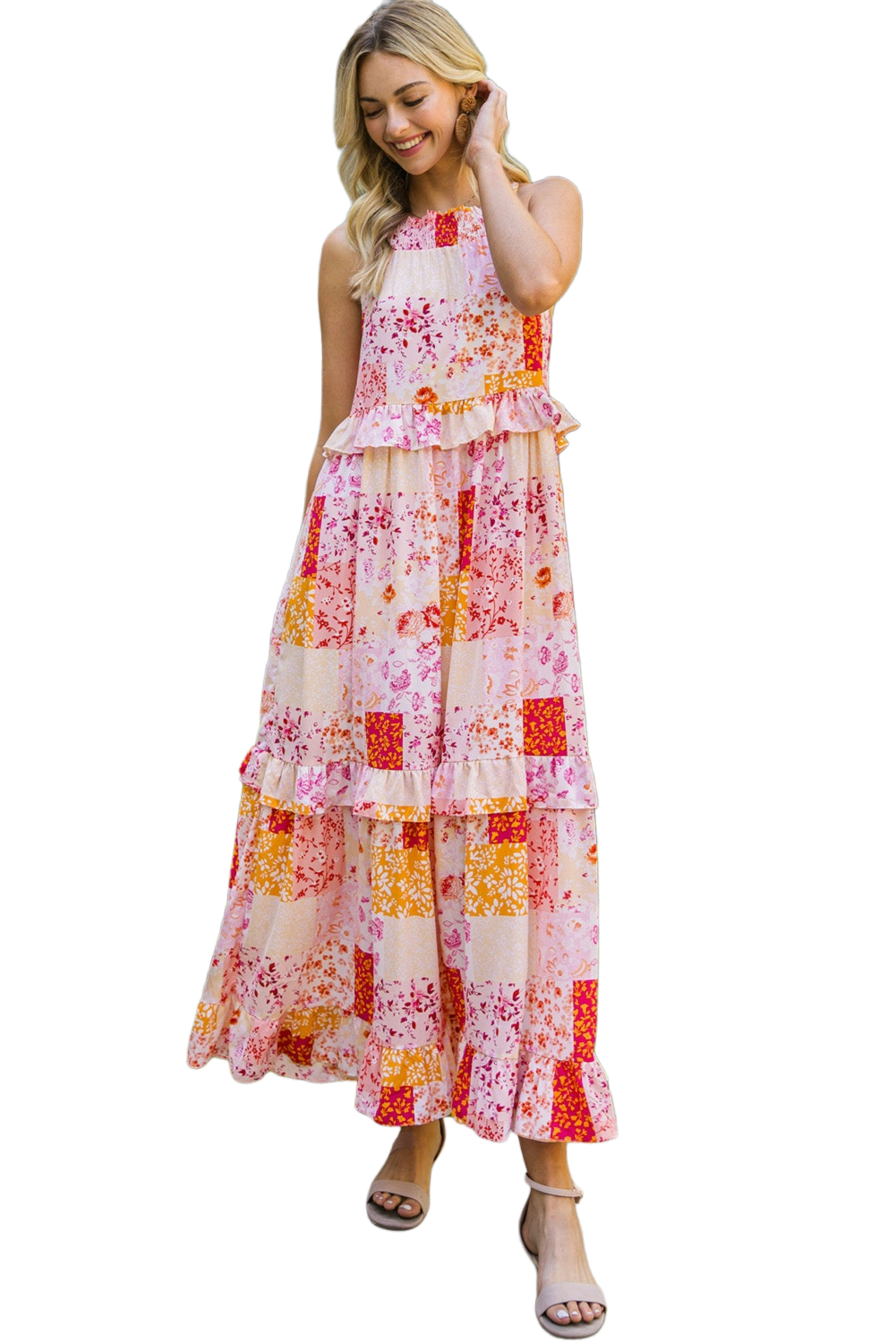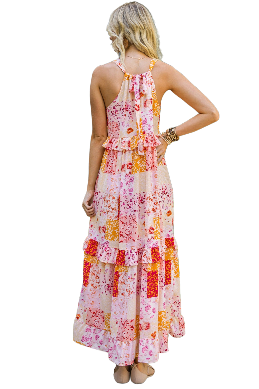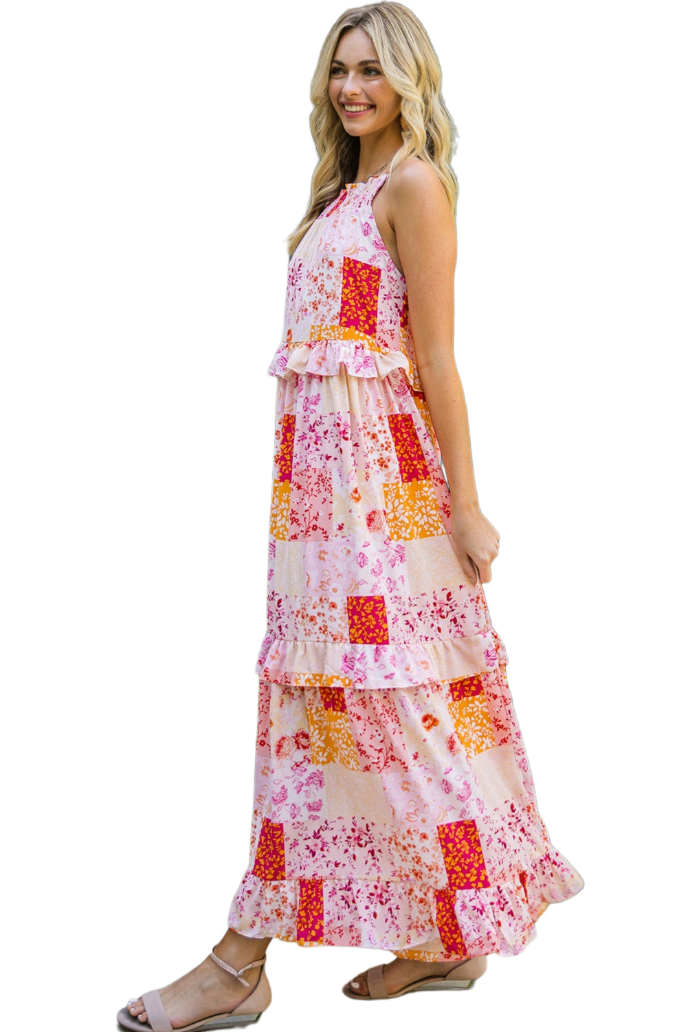 Patchwork Grecian Neck Ruffled Maxi Dress
